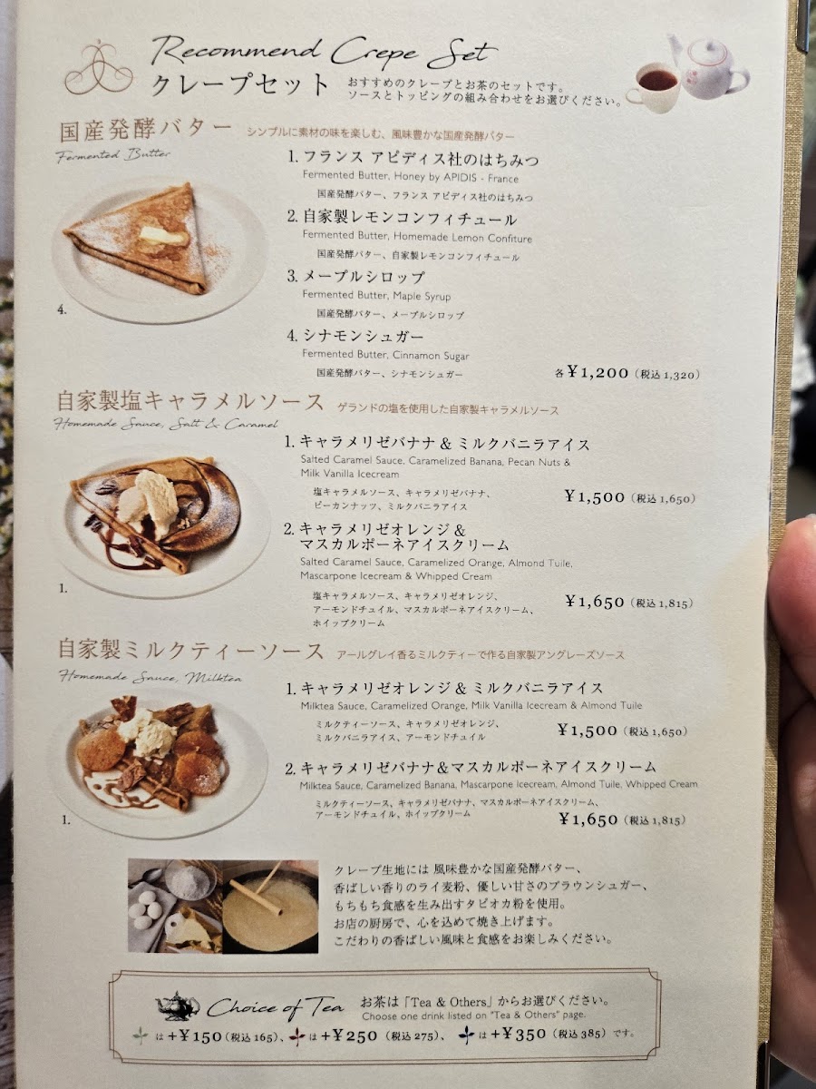 おすすめのクレープとお茶のセットです。ソースとトッピングの組み合わせをお選びください。